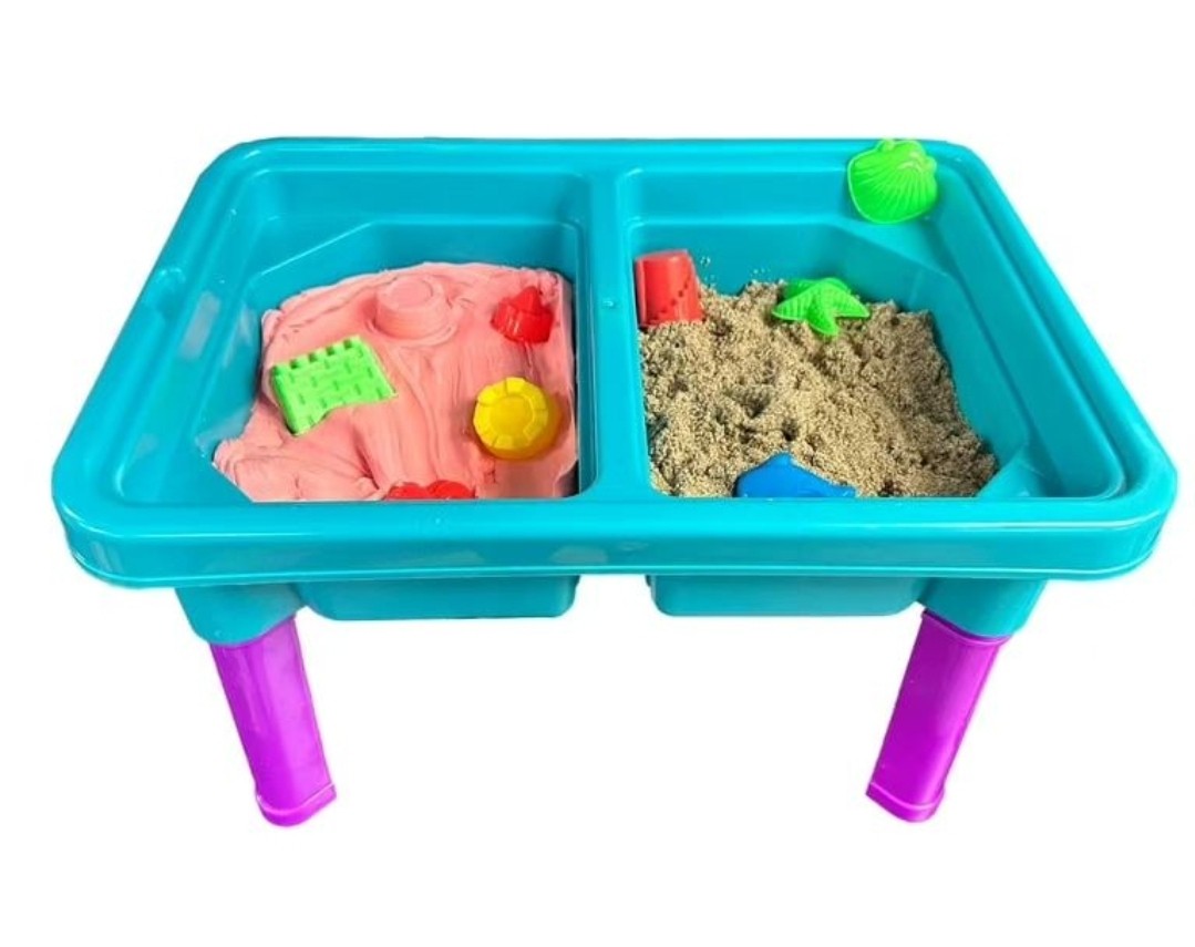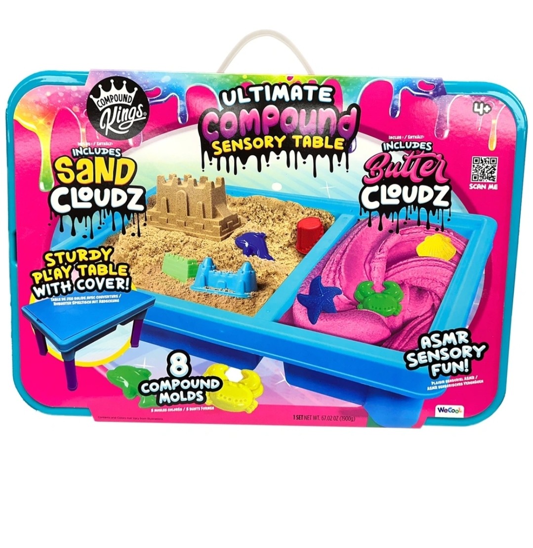 Slime listo para usar recién sacado del paquete Mesa de juego resistente con cubierta y patas desmontables. La mesa de juego se puede plegar para jugar sobre la marcha. Incluye 907 g de compuestos Sand Cloudz y 380 g de Butter Cloudz Contenido: 1x mesa de